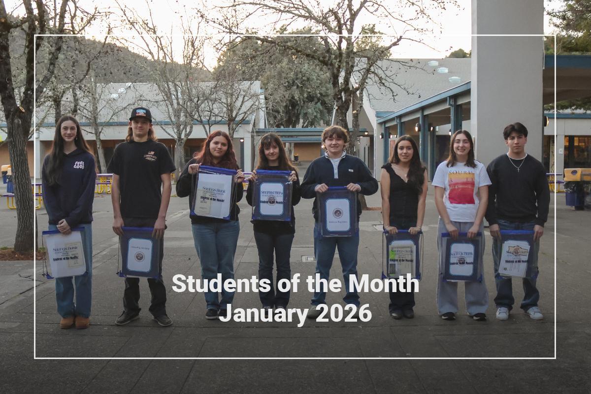 Ukiah High January Students of the Month: Rebecca Kobetz, Kasey Land, Jazelyn Conner Rodriguez, Wren Samana, Maverik Foster, Kimberli Olea, Molly Kaluna-Jones, and Alberto Valencia Escalante. Outstanding achievement and Wildcat pride on full display.